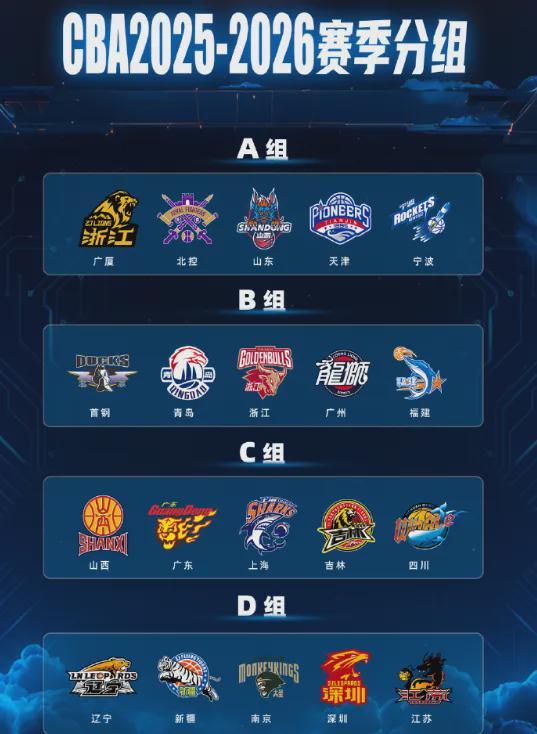 具体分组如下:A组:广厦、北控、山东、天津、宁波;B组:北京、青岛、浙江、广州、福建;C组:山西、广东、上海、吉林、四川;D组:辽宁、新疆、南京、深圳、江苏。